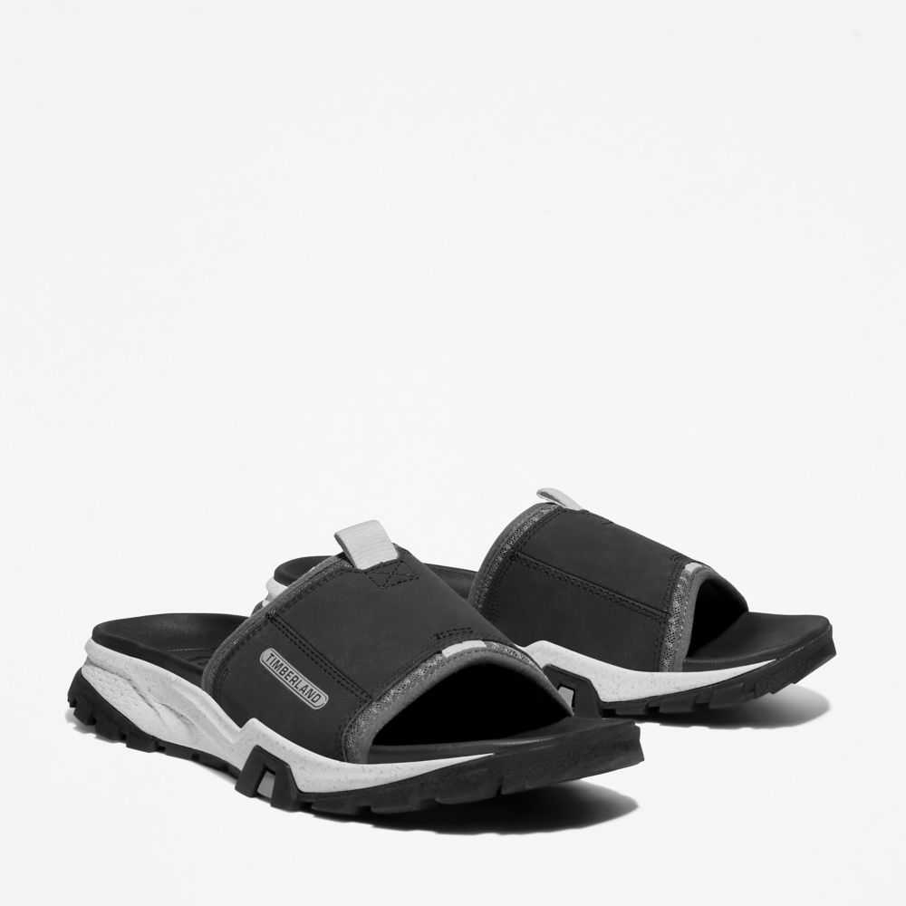 Our Garrison Trail men's slide sandals were designed for comfort,convenience,superior traction,and environmental responsibility.DETAILS • Upper: Better Leather from a tannery rated silver by the Leather Working Group for its water,energy,and waste management practices,and ReBOTL™ fabric containing at least 50% recycled plastic • ReBOTL™ fabric lining • Midsole of compression-molded EVA-blend foam for high-rebound cushioning • Rubber lug outsole with TimberGrip™ traction technology • EVA footbed • Imported